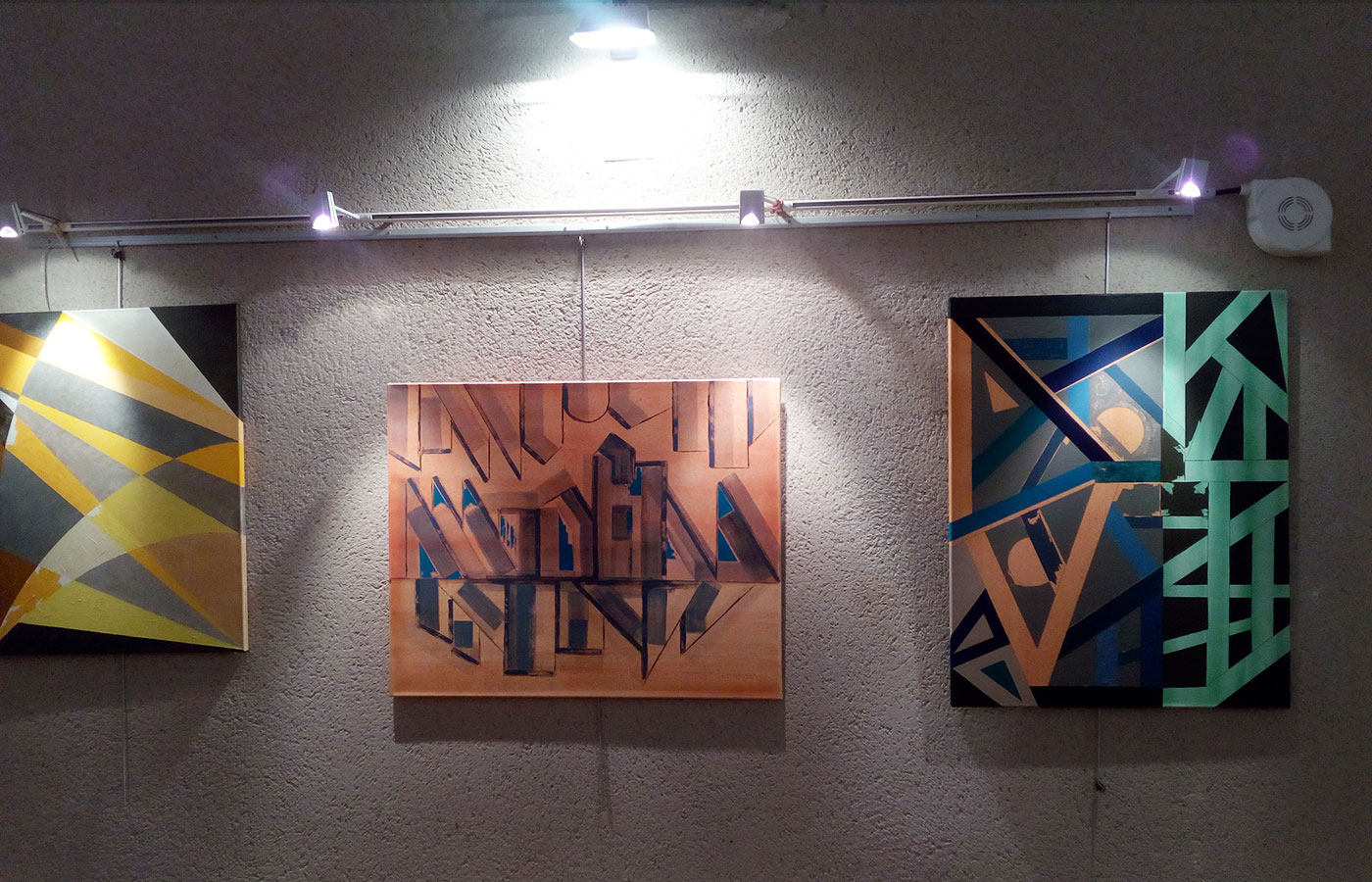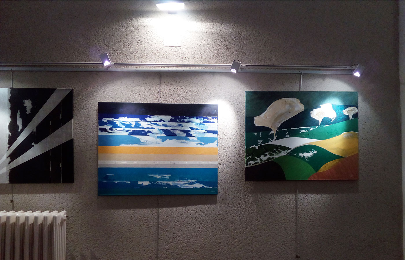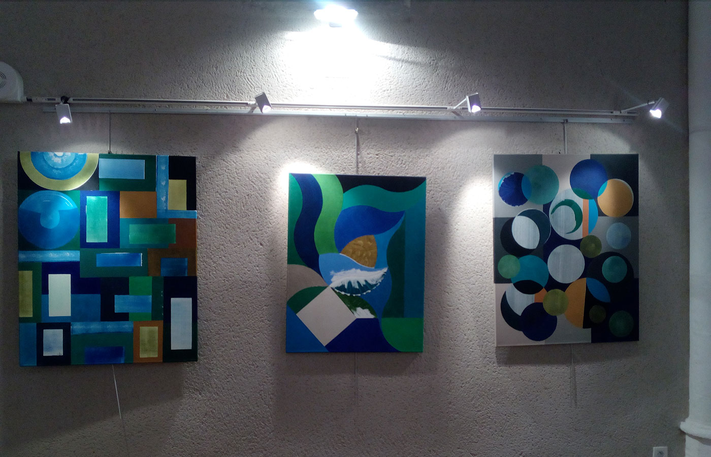Les 3 tableaux : « Messages » sont tout en nuances de bleus, de gris, de blancs. Leurs motifs sont géométriques et très modernes. Ils se présentent à l’observateur comme ce dernier le souhaite : soit horizontal, soit vertical, d’un côté ou de l’autre.