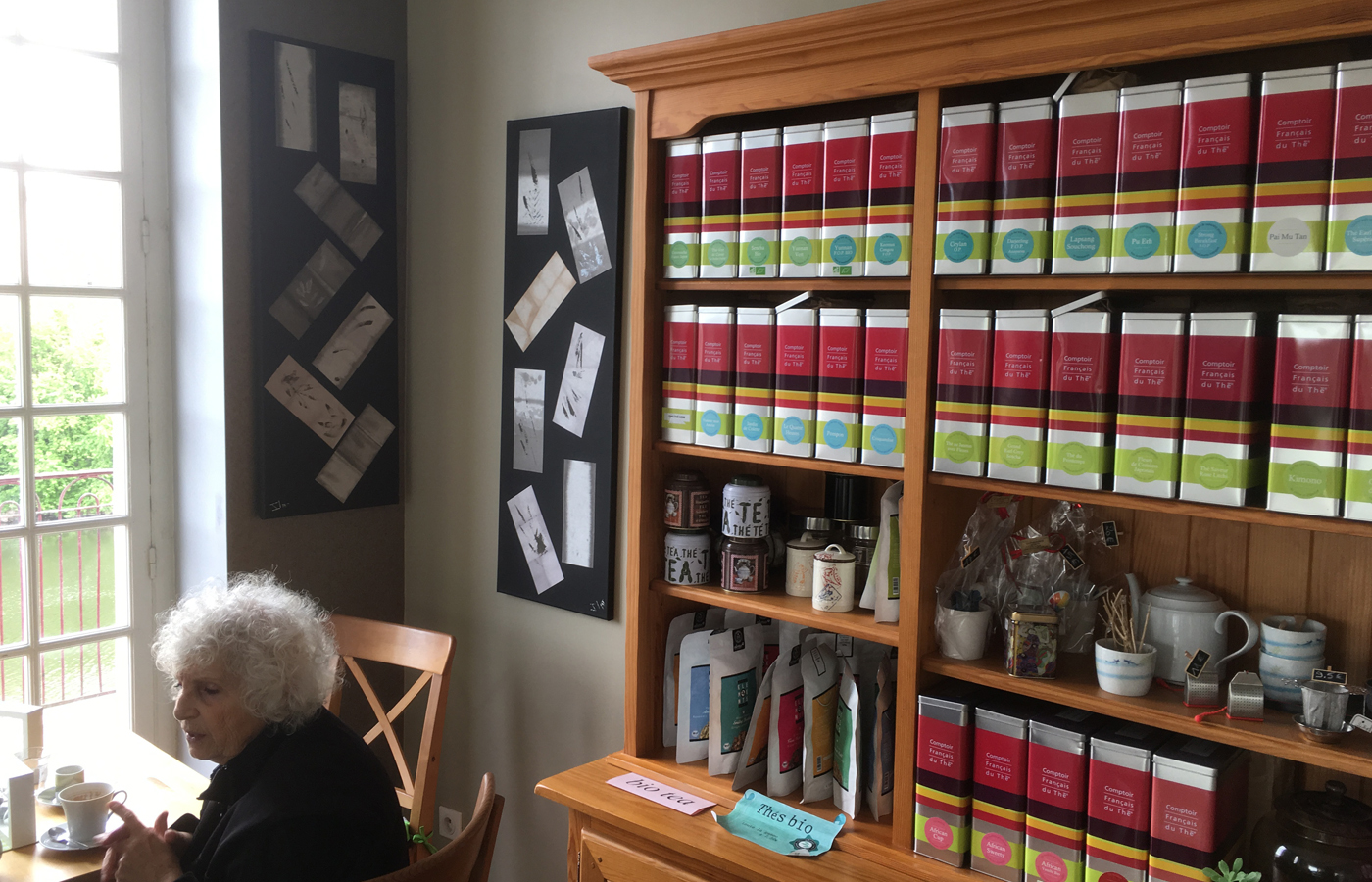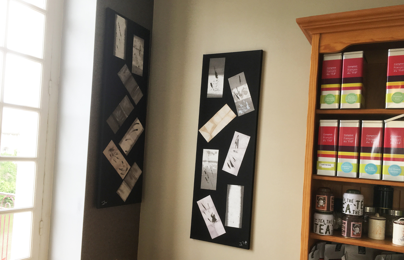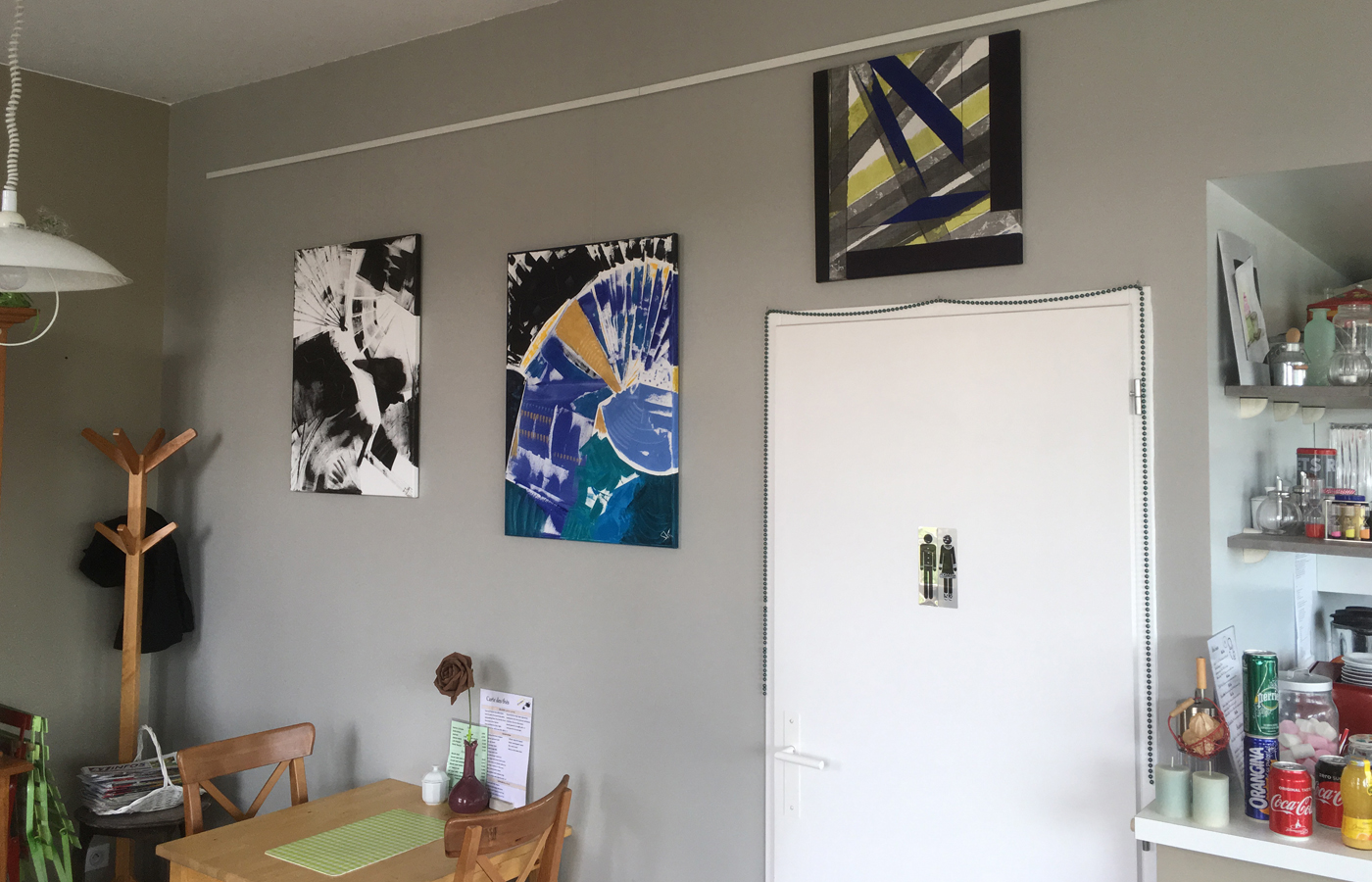 Les cimaises du salon de thé "La Parenthèse" reçoivent trois tableaux colorés et un tableau monochrome de sa série Images Mentales.